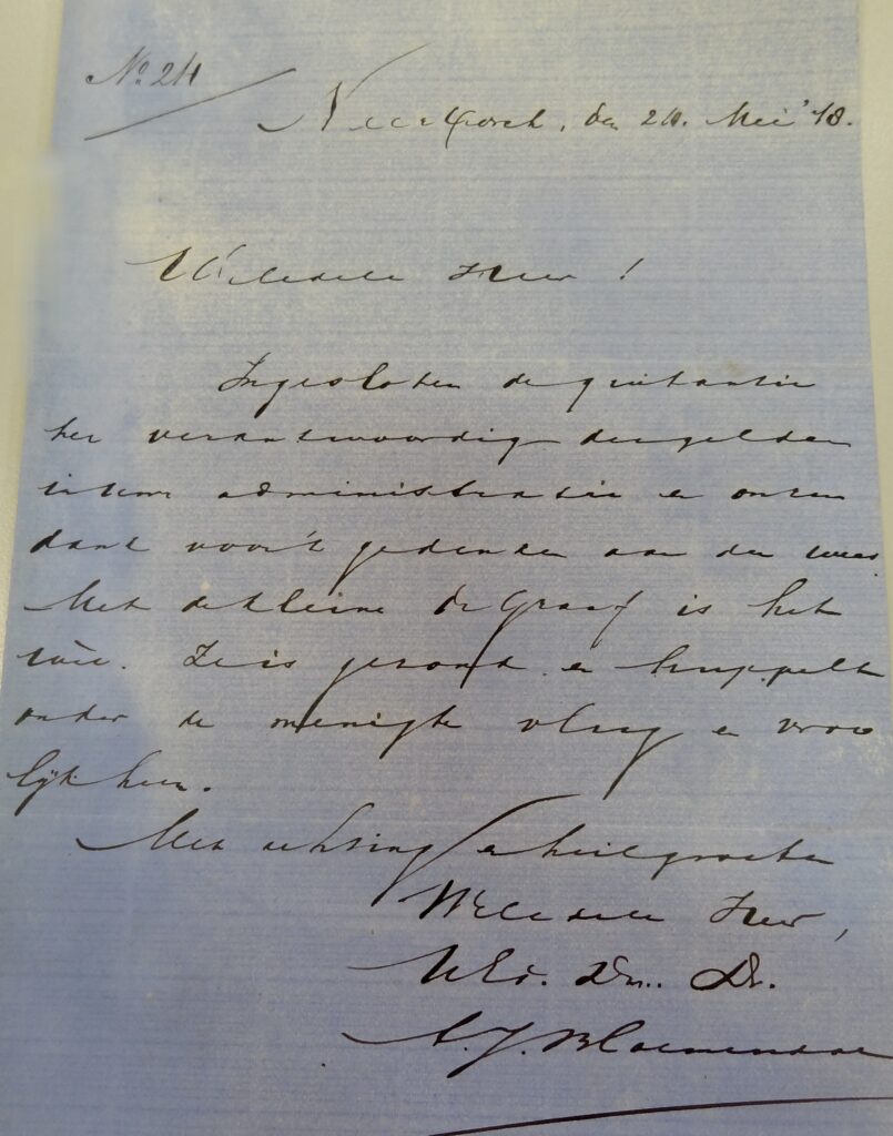 In 1877 was Rika door de diaconie van de Nederlandse hervormde kerk in Delft naar Neerbosch gebracht. ‘Met de kleine De Graaf is het wel’, staat op een klein, wit geruit blaadje in het Delftse archief. Het briefje is gedateerd 21 mei 1878 en door administrateur Arend-Jan Bloemendal verstuurd vanuit Neerbosch. ‘Ze is gezond en huppelt onder de menigte vlug en vrolijk heen’, schrijft hij. Het is een verantwoording van de weesinrichting aan haar financiers en de Delftse diaconie was er daar een van.
